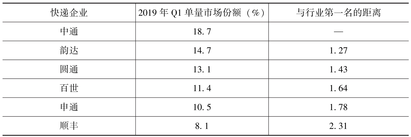 如表1-1所示,在第一阵营CR6中,中通2019年第一季度市场份额仅为18.7%,未达到26.1%这一安全阈值,地位并不稳固。韵达、圆通、百世的市场份额与中通的距离均小于√3≈1.73倍。这说明行业龙头企业仍未形成,未来谁能坐上王座仍是未知数,第一阵营的排位赛结果还不明朗。谁能投入更多资源、采用更佳策略,谁就能更快地提升运营效率。