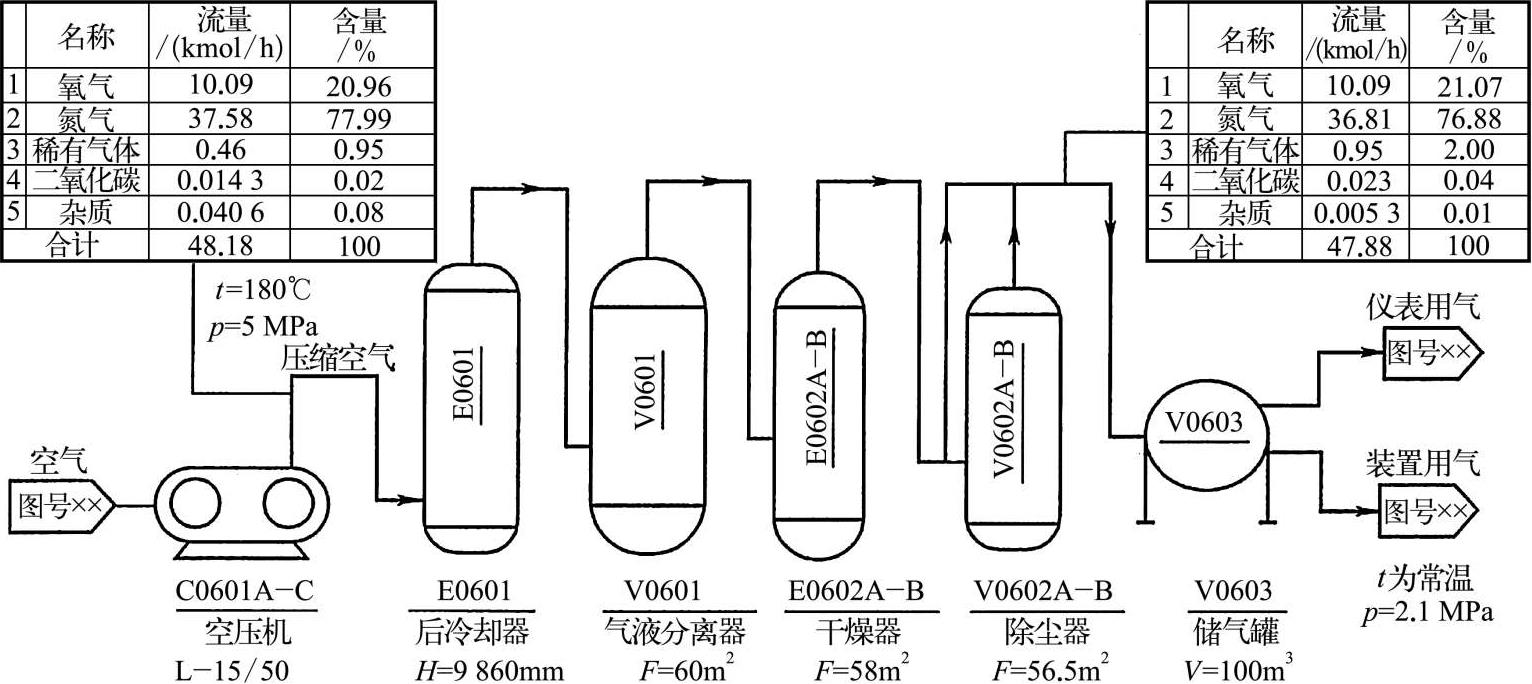 在充分地掌握单元工艺流程图的绘制方式后,在全面地了解整个化工生产工艺流程的基础上,结合理论知识和工作经验,将各个单元工艺流程按照生产要求组合在一起,最后绘制出完整的化工生产工艺流程图。图3-5为某空压站生产工艺流程图。由图可以看出,整个生产工艺流程图由物料输送工艺流程(管路、空压机和储气罐)、传热工艺流程(后冷却器)、物料分离工艺流程(气液分离器、干燥器和除尘器)等单元工艺流程组成。