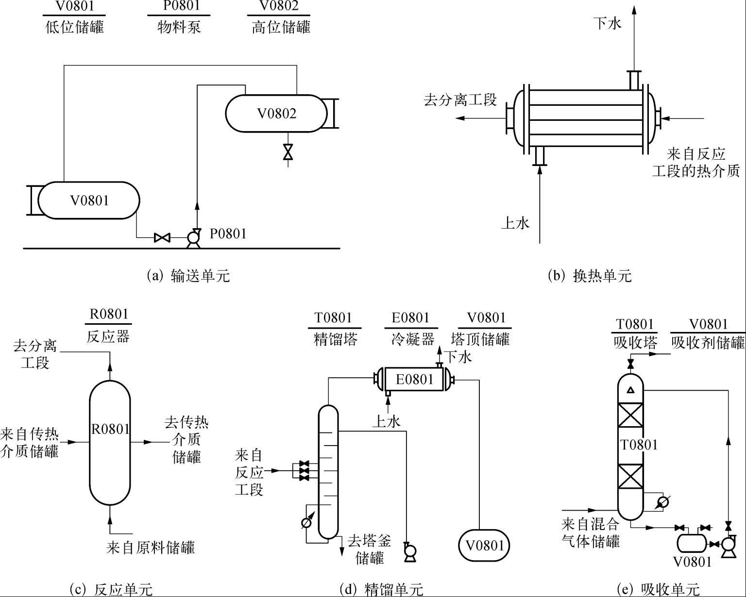 (3)按实际管道的位置,用粗实线画出主要物料的流程线,用中实线画出其他物料(如水、蒸气等)的流程线,各流程线均需要画上流向箭头,并在流程线的起点或者终点处注明物料的名称,还应注明主要物料的来源或者去处。