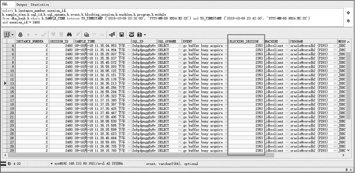 由图2-51可以看出,2480会话也被2353会话堵塞,以相同的方式查看别的blocking_session,可以发现它们都是来自同一个2353会话,如图2-52所示。