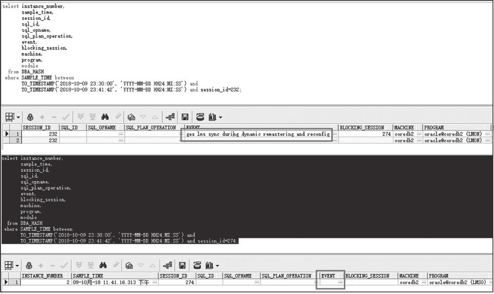“gcs drm freeze in enter server mode”正是DRM期间用户需要操作相同数据块时数据库发生的等待事件,如图2-49所示。