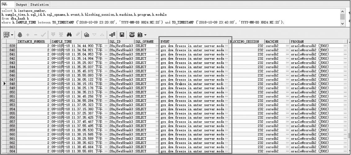 查询故障时间段历史会话视图DBA_HIST_ACTIVE_SESS_HISTORY,根据等待事件分类统计,结果如下: