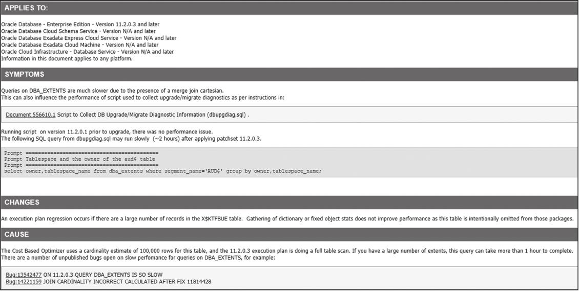 从字面意义上我们可以知道,对区的任何操作都需要访问x$ktfbue,至此问题终于明朗了,是对x$ktfbue的访问出现了性能问题,既然收集统计信息也无法规避,那就查询MOS:Query Against DBA_EXTENTS Performs Slowly After Upgrade to 11.2.0.3 (Doc ID: 1453425.1)。