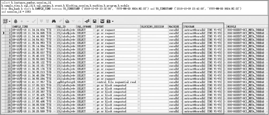 从以上会话信息中我们可以看出,最终锁的源头来自2353号会话,它没有被任何会话堵塞,经排查,此会话是OGG(Oracle GoldenGate)挖掘进程,在执行SQL 23j1ukc8sjv4v时构建了大量的全局CR块。分析到这里,触发的条件也已经很明确了,是OGG抽取进程引起的。