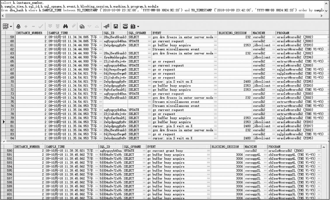 从历史视图统计信息来看,前几位与AWR报告中的Top 5相吻合,进一步排查相关等待事件的blocking_session,结果如下: