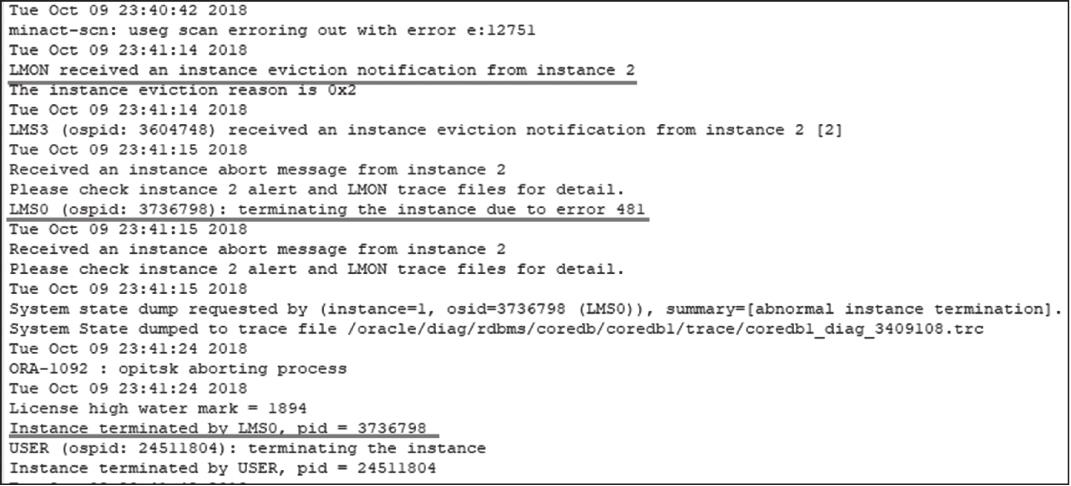 2018年10月9日23:34:18,LMS进程开始启动DRM,直到实例宕机都没有结束,结合LMON的信息,我们可以猜测当时节点间通信的私网流量较大。