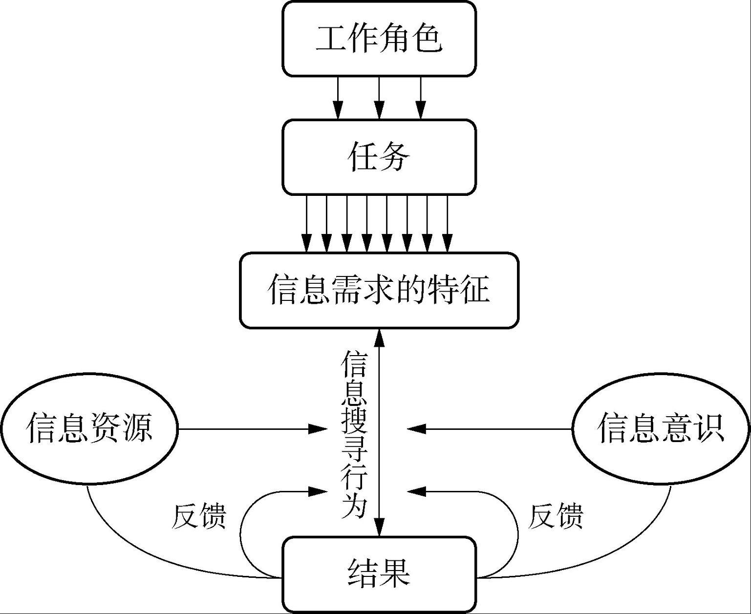 这个模型中的主要因素是:①工作角色,如管理员、经理、研究员等;②任务,如咨询、评估和监督;③信息需求的特点,如人口统计数据(年龄、职业)、范围(如根据具体情况需要)、频率(如经常需要或新的),见图2-2。
