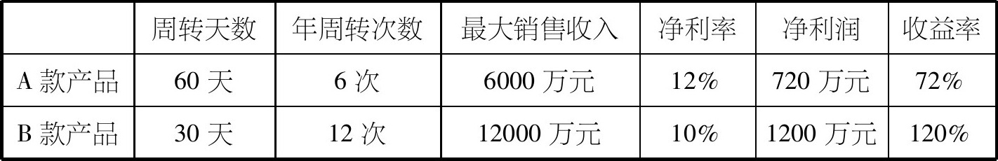 假如公司有A、B两款产品,根据市场的一般售价,A款的净利率有12%,B款的净利率只有10%。由于我们的资金有限,不可能两款同时生产,你会选择哪款呢?很多人会说:“当然是生产A款。”笔者再告诉你,A款的回款天数是60天,B款的回款天数是30天,那么这个时间你会选择哪款呢?我们简单算一下就知道了。为了方便理解,假设投资的1000万元全部用作流动资金来发货给客户,资产收益率比较如表4-3所示。