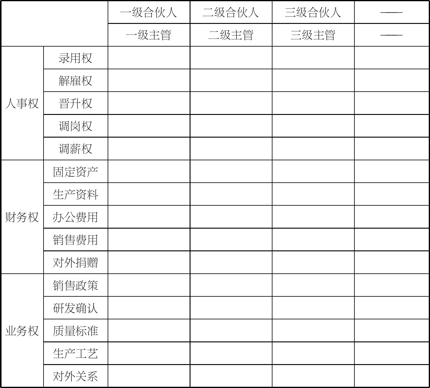 我们可以采用“置顶思维”往下推演,也就是某一类权限的最大授权是什么?能不能把这个权限赋予相关合伙人?如果不能,那么就退而求其次;还不行,就求再次。