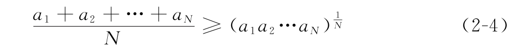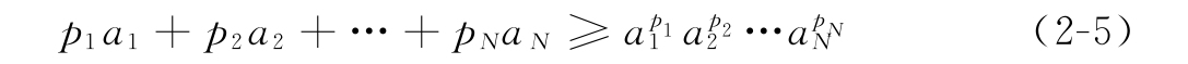算术平均-几何平均不等式,即式(2-4)是更一般结果的特例。请注意,其左侧代表一个等权重的平均值。如果我们考虑一个带有非负权重的加权平均值,即a 1 ,a 2 ,…,a N 都是非负实数,权重p 1 ,p 2 ,…,p N 均非负,且满足p 1 +p 2 +…+p N =1,则广义算术平均-几何平均不等式是