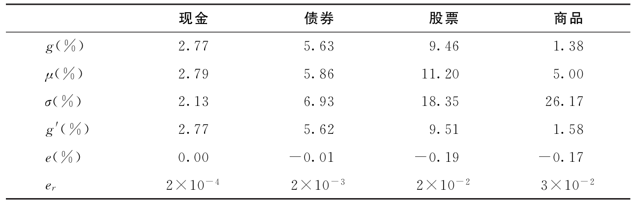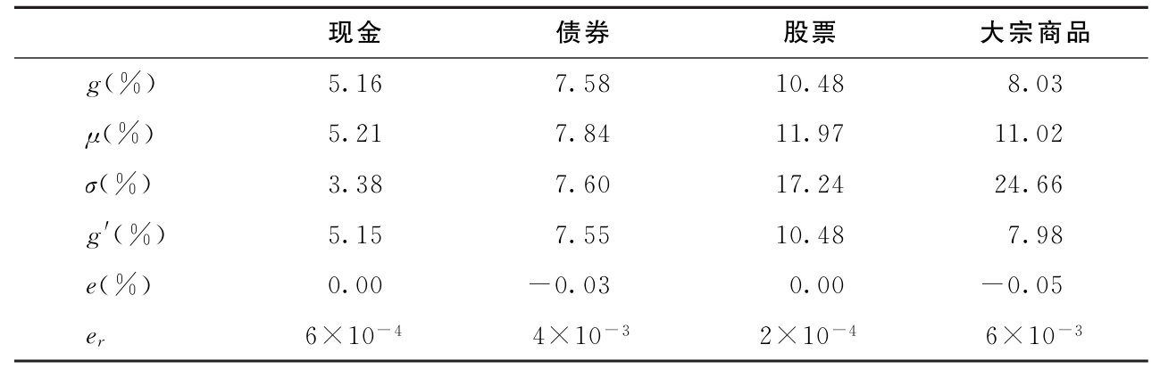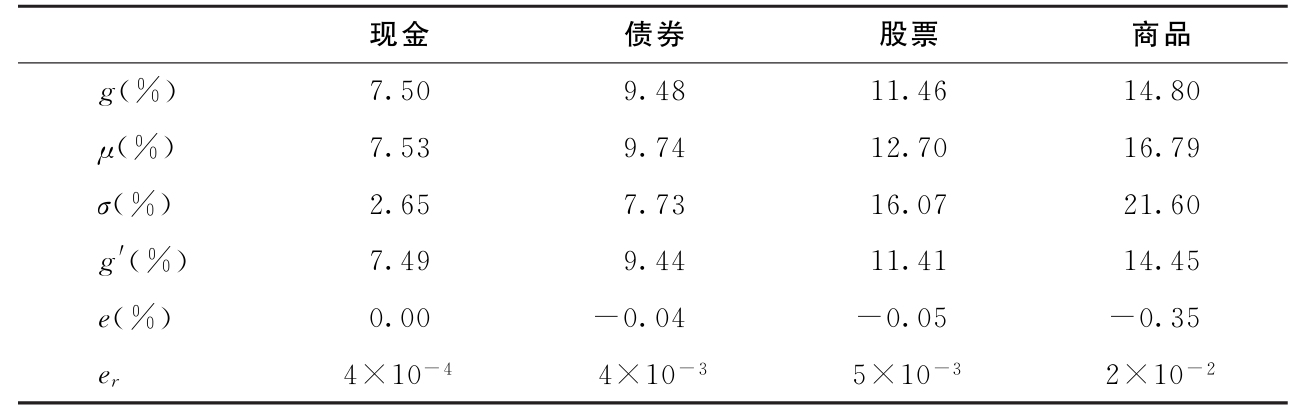 该表显示,对于所有资产类别,g′=μ-σ 2 /2都非常接近g。特别是对于现金和股票,两者之间的误差大致为零。对于债券和大宗商品而言,误差只有几个基点(bps;一个基点是0.01%)。