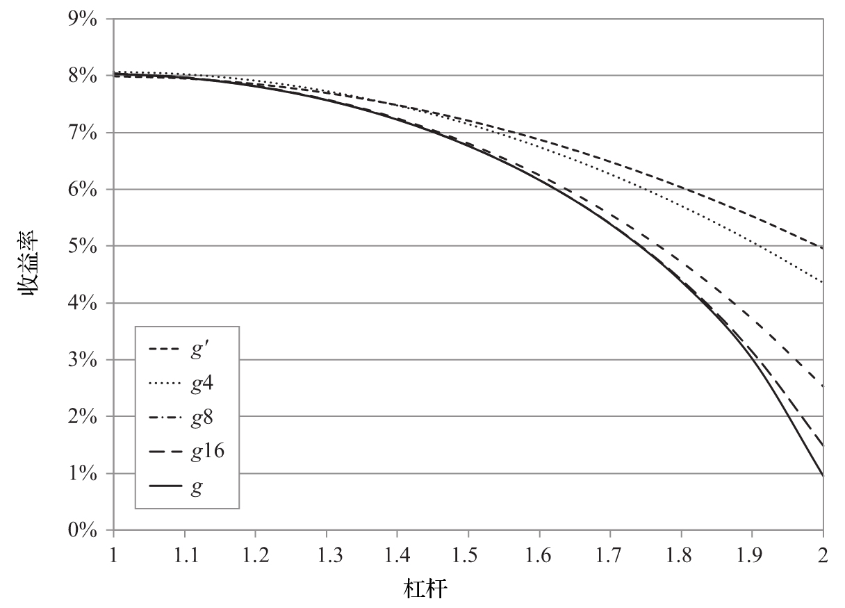 ·当杠杆水平较低时,近似公式g′表现得相当好。然而,随着杠杆的增加,近似精度稳定地下降。当杠杆达到2时,g接近1%,而g′还在5%附近。同时,注意到g′总是高于而不是低于g。当收益波动率随着杠杆增加时,近似误差也不断增加。这可能是由近似公式g′中省略的其他具有负系数的高阶项所致,例如负的偏度。