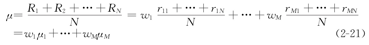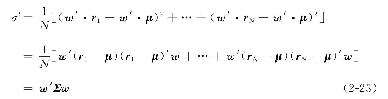 换言之,投资组合收益的算术平均数是单个资产算术平均收益的加权平均数。如果我们用向量μ=(μ 1 ,μ 2 ,…,μ M )′表示单个资产的算术平均收益,那么式(2-21)就可以写成μ=w′·μ。我们把投资组合的几何平均收益率的定义留到下一章。