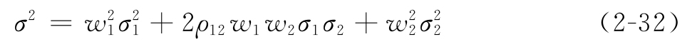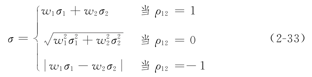 在一些读者看来,例2.5的权重不适合实际的投资组合,因为它们的和不等于1。这在严格意义上是正确的。然而,我们可以通过在资产1中投资100%(做多)、在资产2中投资-100%(做空)和在无风险资产中投资100%(做多)来使其成为一个实际的多空投资组合。此时,权重之和为1,这个多空投资组合的波动率将由式(2-34)给出。
