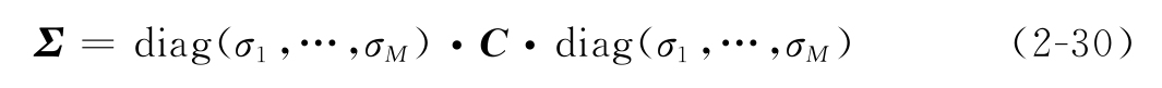 )是一个对角线矩阵,其对角线上的元素为单个资产的波动率。利用成对相关性,式(2-28)可以写成
