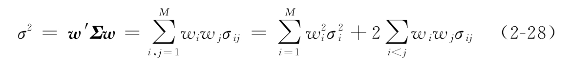 第一个求和项由单个资产的方差组成,第二个求和项由不同资产形成的所有成对的协方差组成。