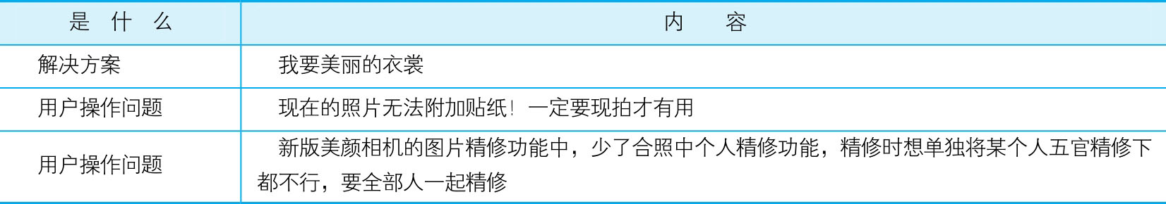 以上3个需求都是伪需求,也就是说,不是真正的需求,但它们又常在产品经理的需求登记表里出现。这些伪需求实际上是需求提出者想得到的解决方案,或者是用户遇到的操作问题,如表1-1所示。