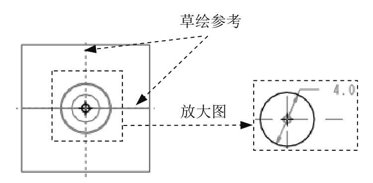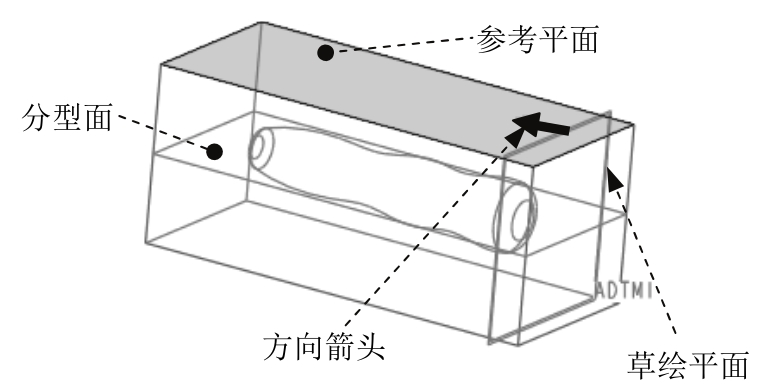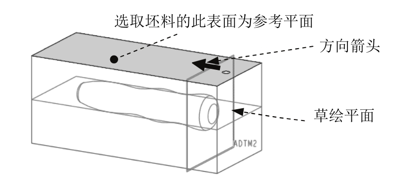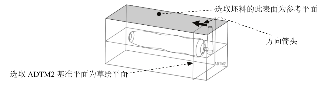 命令,选择ADTM1基准平面为草绘平面,选取一个与分型面平行的坯料顶面为参考平面(图2.6.4),方向为