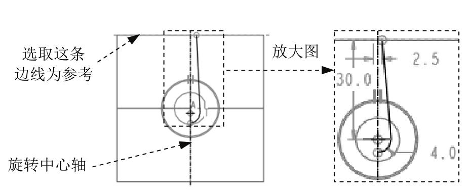 (3)进入截面草绘环境后,依次选取MOLD_RIGHT基准平面和图2.6.5所示的边线为草绘参考,然后绘制图2.6.5所示的截面草图(注意:要绘制旋转中心轴)。完成绘制后,单击“草绘”操控板中的“确定”按钮