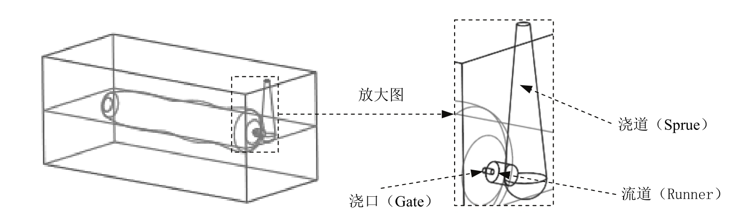 下面的操作是在零件handle.prt的模具坯料中创建图2.6.1所示的浇注系统,以此说明在模具中创建特征的一般操作过程。