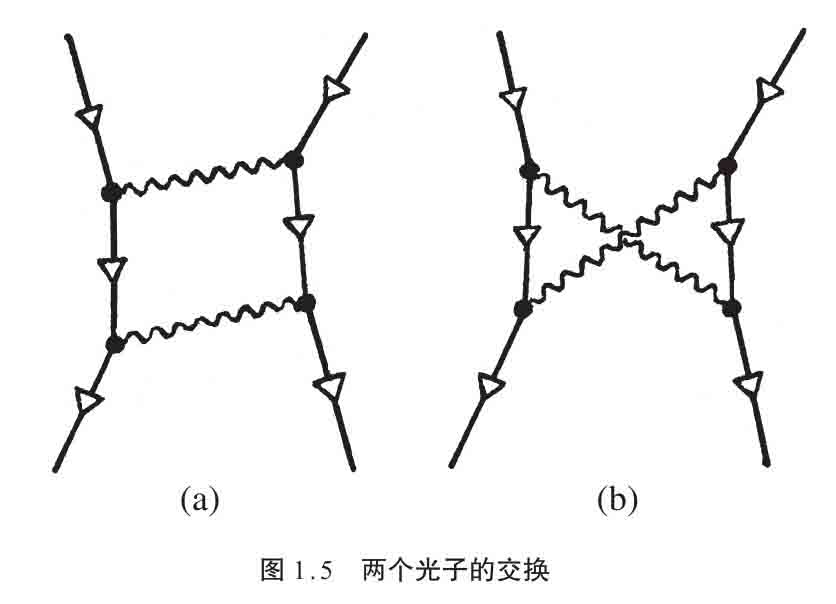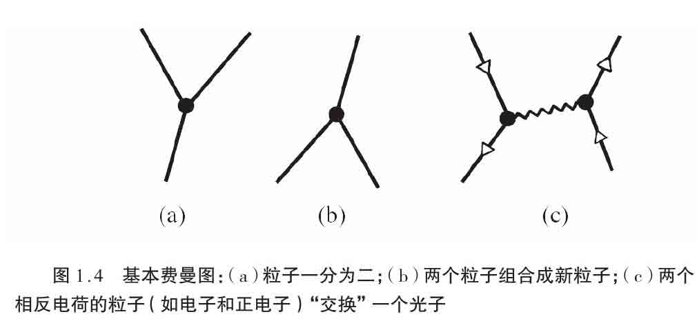 将费曼图看成特定所涉粒子过程集合的时空图,也不算太离谱。我是研究相对论的,不是粒子物理学或QFT专家,喜欢用沿页面向上来表示时间,而专家们通常用从左向右来表示时间方向。费曼图以美国物理学家费曼(Richard Phillips Feynman)的名字命名。图1.4列举了几个基本图样。其中,图1.4a表示一个粒子分裂成两个粒子,1.4b表示两个粒子结合形成第三个粒子。在图1.4c中我们看到在两个粒子之间交换一个粒子(如光子,即电磁场或光的量子,以波浪线表示)。在这个过程中用“交换”一词,虽然是粒子物理学家的惯用法,还是显得有点儿奇怪,因为 单个 光子只是从一个端点的粒子传到另一个——尽管分不清哪个粒子发射,哪个粒子吸收。这种交换的光子通常被称为 虚 粒子,它的速度不受相对论要求的约束。口头说的 交换 也许更适合图1.5b所示的过程,尽管图1.5的过程一般说来是两个光子的交换。