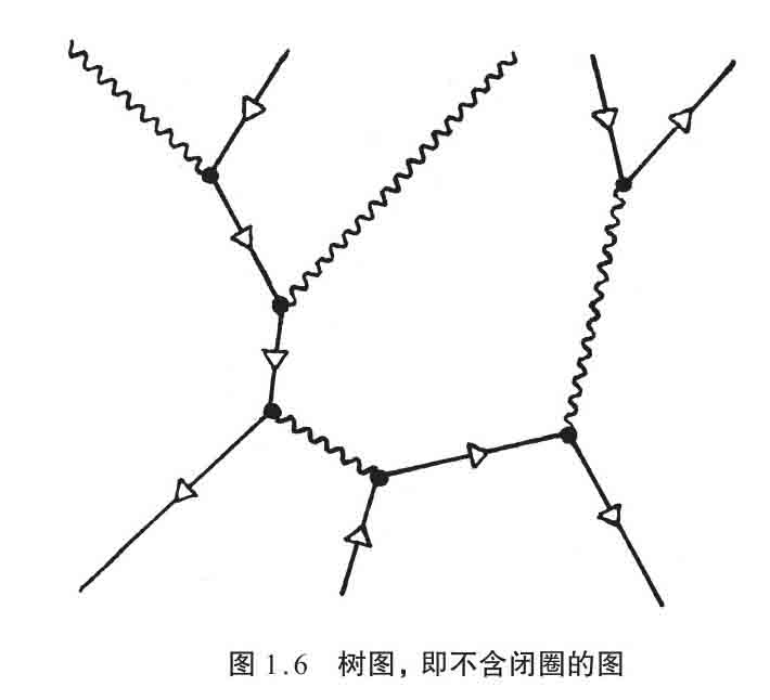 这样,即使单个的费曼图,给定进出粒子,我们也可能需要把无限多个过程加起来。(技术上说,“加起来”将用连续的积分形式,而不是离散的求和,见附录A7和A11,不过其间的差别在这里并不重要。)这种情形出现在费曼图包含 闭圈 的时候,如图1.5的两个例子。对图1.4和1.6那样的树图,没有闭圈,内粒子能量和动量完全由外粒子的值决定。但这些树图没有揭示粒子过程的真正的量子本性,因此我们需要引入闭圈。闭圈的麻烦在于,沿着闭圈的能量-动量是没有限制的,它们可以一圈圈地环绕,因此加起来就会 发散 。