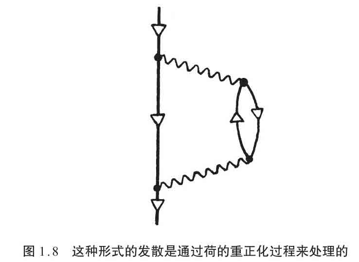 这里特别要注意的是标准的QFT重正化过程。先看看它是如何运作的。根据不同的直接QFT计算,我们得到一个介于粒子的所谓 裸荷 (如电子)与 衣荷 之间的无穷大标度因子,后者也就是我们在实验中实际观测的东西。这是因为图1.8的费曼图所示过程的贡献,它将抑制测量的荷值。问题是,图1.8(和其他很多类似过程)的贡献是“无穷大”(有闭圈)。于是我们看到,为了得到有限的观测值(衣荷),裸荷必须是无限的。这个重正化过程的基本根据是承认QFT在发散出现的极小距离上可能不会完全正确,理论的某个未知的修正或许能补充有限答案所必须的截断。于是,这个过程要我们放弃计算自然的那些真实的度量因子(如粒子的电荷、质量,等等)的努力,而是将QFT强加给我们的所有无限的度量因子聚在一起,接着,我们直接用在实验中观测的裸荷(和质量等)将这些无限的贡献有效地打成整齐的小包,然后忽略它们。令人惊讶的是,对适当的所谓 可重正化的 QFT理论来说,这个过程可以系统地完成,使很多其他QFT计算能获得有限的结果。衣荷(和质量)等数值来自观测而不是来自适当QFT的计算,这些值就得出了那30个参数中的一部分;前面说过,那些参数必须从实验观测值来填补标准模型。