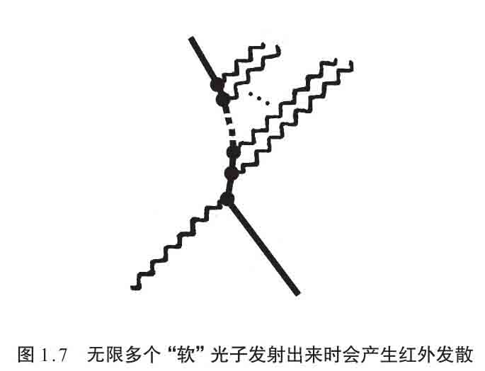 应该指出,QFT还存在所谓的 红外发散 。它们出现在尺度的另一端,能量和动量都非常小,因而牵扯非常大的时间和距离。这些问题与闭圈无关,而与图1.7那样的费曼图有关,其中一个过程可能释放无限多个 软光子 (即能量很小的光子),它们加在一起也会发散。QFT专家们倾向认为红外发散不像紫外发散那么严峻,而且有很多方法(至少暂时地)消除它们。然而,近年来,它们的重要性开始越发显露出来。就眼下的讨论来说,我不想太关注红外发散问题,而想集中说说,QFT如何解决因费曼图闭圈产生的紫外发散问题,弦论的思想又是如何有希望让我们摆脱困境。