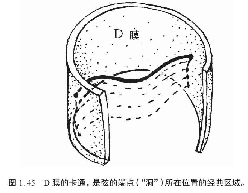 接下来我们看膜世界的问题。我在1.13节提到过为刻画M理论的不同对偶性所需要的(除了弦以外)那些叫 p 膜的实体(弦的高维形式)。弦本身(1膜)可以有两种根本不同的形式: 闭弦 (可描述为普通的紧黎曼曲面,见图1.44a和A10节)和 开弦 (其黎曼曲面有洞,见图1.44b)。除此以外,应该还有所谓的 D 膜 结构,在弦论中扮演着不同的角色。D膜被视为高维时空的经典结构,可假定为基本弦和 p 膜构成的大聚合体,其特征却是超对称方程通过对称和超对称要求得到的经典解。D膜发挥的一个重要作用是开弦的“端点”(即孔洞)该处于什么地方。见图1.45。