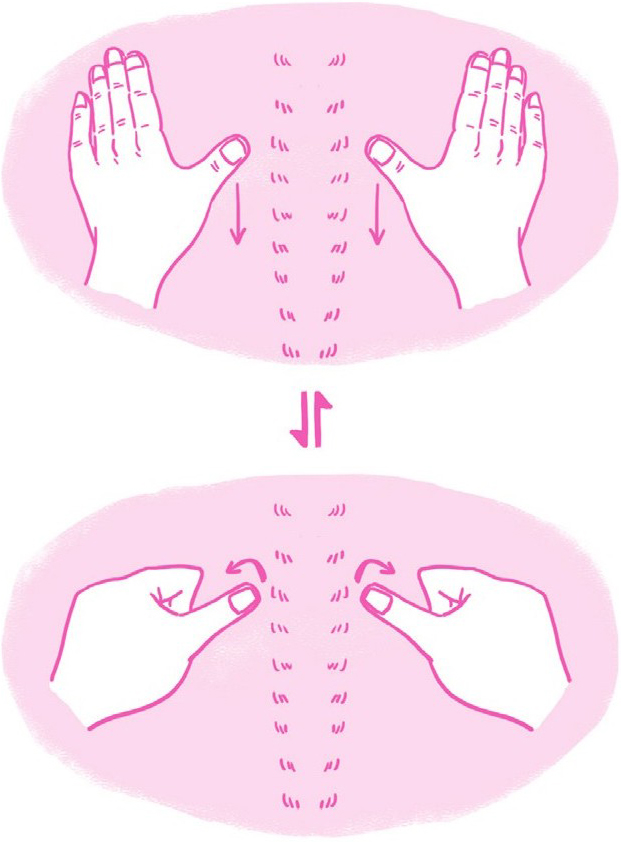 ①按摩脊柱及脊椎两侧:适用于腰背部疼痛明显者。准爸爸先将两手张开,顺着脊椎两侧由胸脊向下按压滑动,然后以拇指指腹,沿着脊椎两侧,一节一节地轻轻按压,两种手法可交替应用。