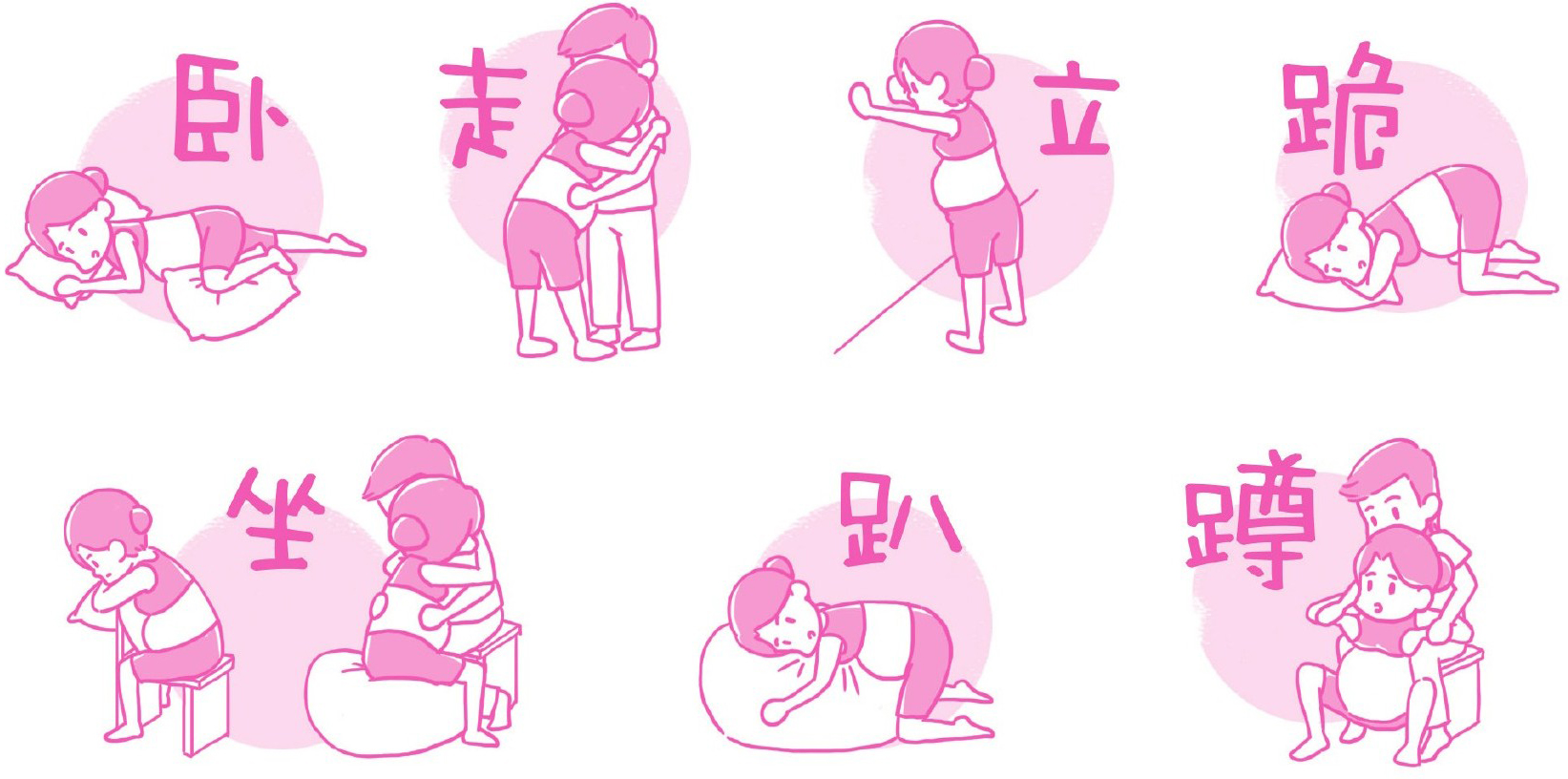 (6)自由体位:在产程中采用卧、走、立、坐、跪、趴、蹲等孕妈妈自感舒适的体位,加速宫口扩张和胎先露下降,从而缩短产程,促进自然分娩。