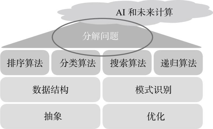 在这个开篇短章中,我将介绍计算思维中看似最简单但其实最强大的概念: 分解问题 。在图1-1中,大家可以看到,分解问题是计算思维这栋房子的“屋顶”。问题被分解后,各类算法才能上阵发挥作用。
