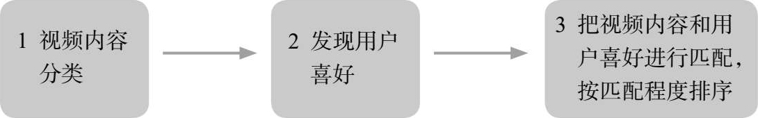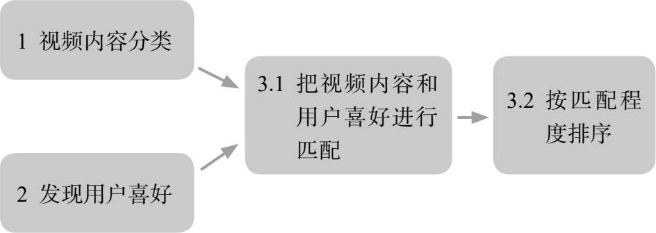 用分解问题的思路,抖音个性化推荐短视频这个问题可以拆解成:(1)把所有的视频按内容分类和排序;(2)根据所有用户以前各自的观看习惯,推导出喜好;(3)把视频内容和用户喜好进行匹配,按匹配程度排序。现在,我们可以把这三步用我们刚学会的流程图来表示(见图1-6)。