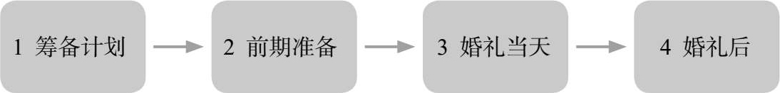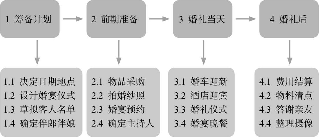 如图1-10所示,我们可以先在大的层面按事件发生的时间顺序把婚礼拆解为筹备计划、前期准备、婚礼当天和婚礼后。