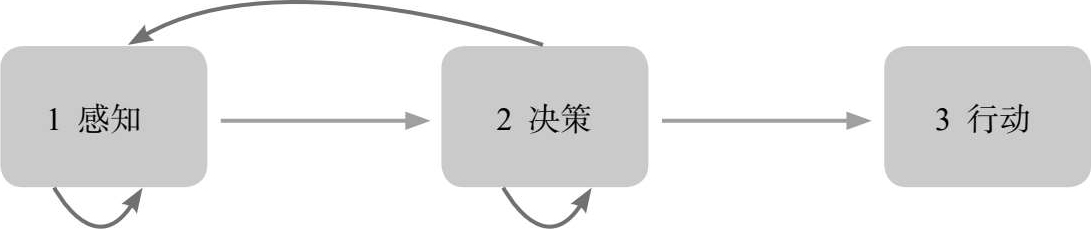 上面这三步可以串行,多个这样串行的步骤又在同时进行,不断地感知、决策、行动。当然,这三步中的每一步又可以分解成若干小步。尤其是第二步决策,它可能会使用非常复杂的算法,比如深度学习算法等。在第3章讲分类的时候,我会更加细致地告诉大家,在决策这一步有哪些分类问题。真实的计算机系统还要处理各种边界条件,但这并不妨碍我们理解它解决问题的大体思路。
