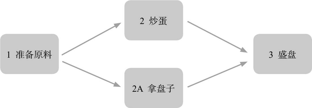 那什么是并行呢?在第二步的同时,也就是炒蛋的同时,我们可以把盘子准备好,这就叫并行。简单地说,并行就是在同样的时间里同时做多件事。在图1-5所示的流程图里,并行被表示为不同的通道。大家可以看到,并行的两个通道上的任务2和2A可以同时做,但是2和2A必须都发生在任务1之后,任务3之前。