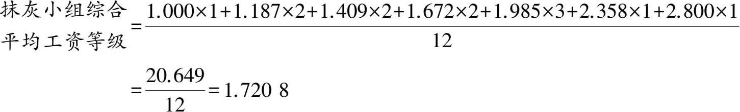 【例3.2】 某抹灰班组由12人组成,各等级的工人及工资等级系数如下,求综合平均工资等级系数和工资标准(已知 F 1 =33.66元/月)。