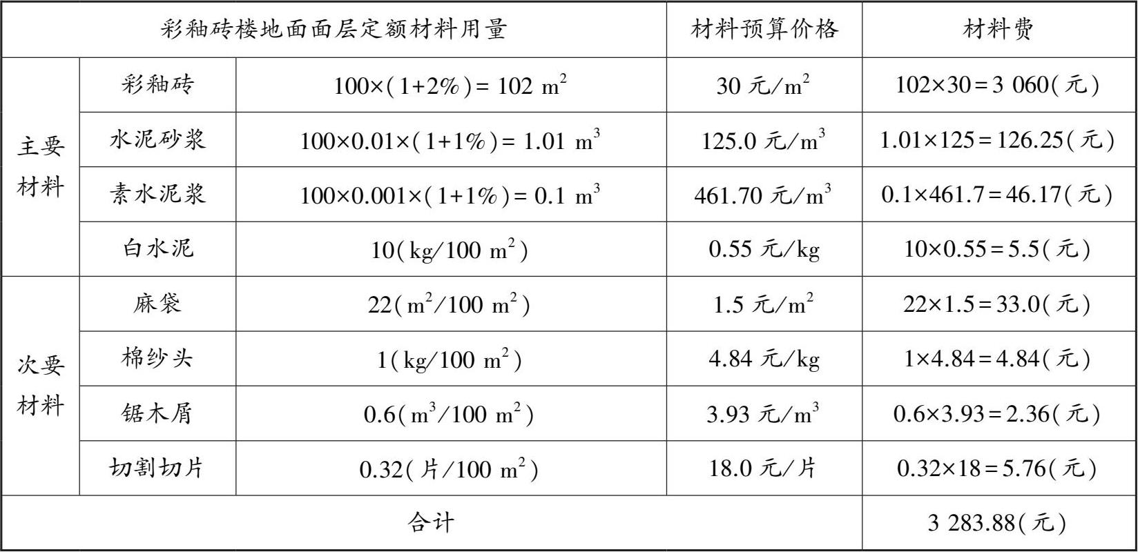 【例3.8】 计算贴100m 2 彩釉砖楼地面面层的材料费。已知彩釉砖、水泥砂浆的损耗率分别为2%与1%,水泥砂浆结合层厚10mm,块料间缝隙为1mm。材料的定额消耗量与材料的预算价格计算见表3.6。