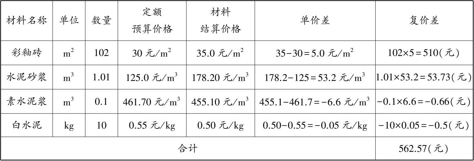 【例3.9】 根据例3.8的材料消耗量,按表3.6内材料结算价格调整主要材料的价差。