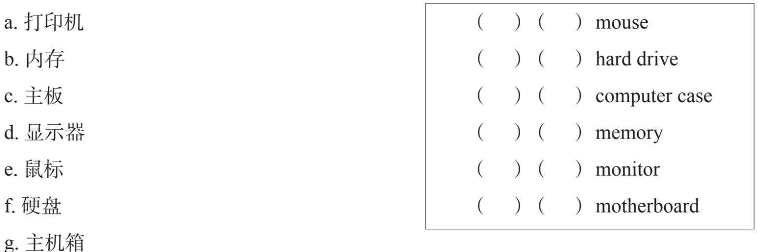 The passage you have read is about computer components. The following are some useful expressions and explanations for computer hardware. Read them carefully and find the items equivalent to those given in English in the table below. Then write the corresponding letter in the brackets.