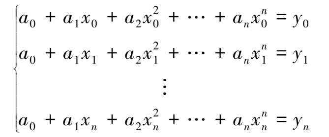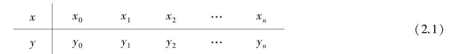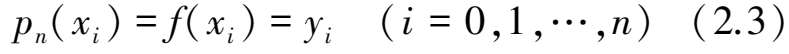 由插值问题的定义可知,多项式插值问题是:在区间[a,b]上,根据函数表(2.1),构造一个次数不超过n的代数多项式p n (x)=a 0 +a 1 x+a 2 x 2 +…+a n x n ,使