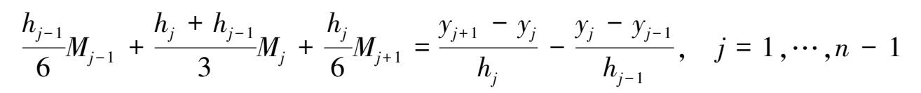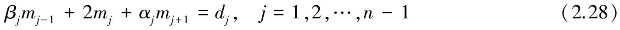 由二阶导数在内节点处连续S j″ (x j +0)=S″ j -1(x j -0),j=1,2,…,n-1可导出关于参数m j 的方程组