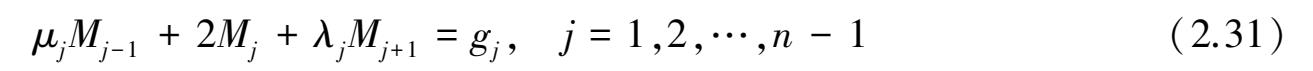 方程组(2.31)称为三弯矩方程。它含有n+1个参数M 0 ,M 1 ,…,M n ,还需要利用前面的任一组边界条件才能完全确定所有参数。例如,给定边界条件