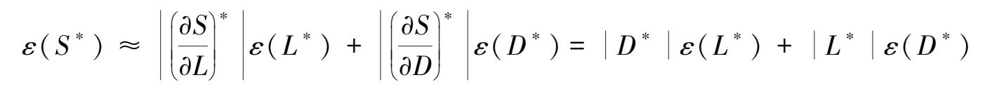 例1.5 设已测得某长方形场地的长和宽的范围分别为L=(110±0.2)m,D=(80±0.1)m,求该场地的面积S,并估算其绝对误差限和相对误差限。