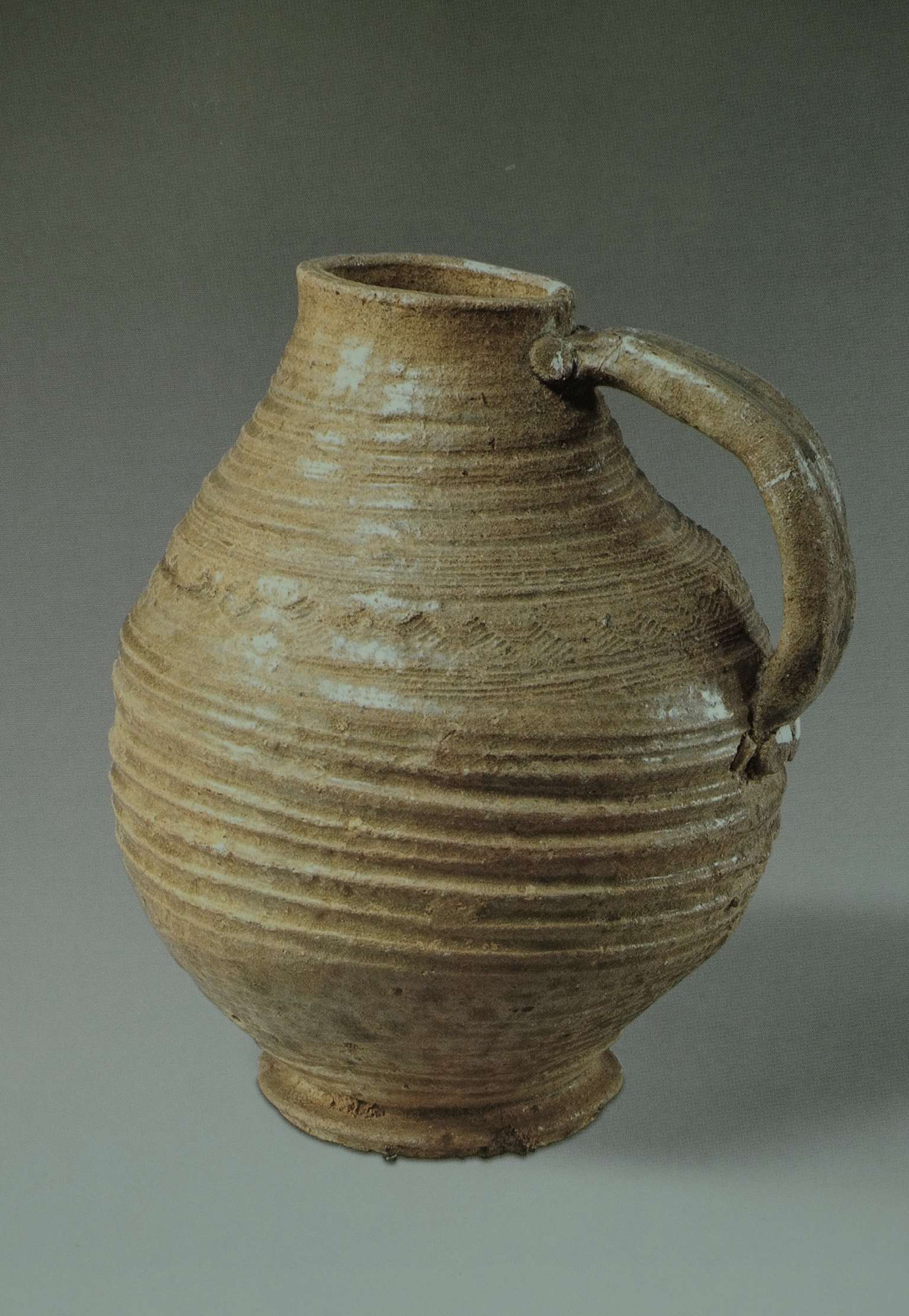 壶粗糙的表面暴露了它的质地——陶,但一个细节却动摇了这一观察。壶身表面有一层薄薄的釉,微微闪着光。这是陶与瓷之间的一个重要区别。不过,要把它称做瓷器还为时尚早,简单归于陶器又似乎亏待了它,于是被叫做原始青瓷。