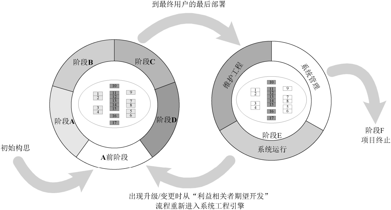 进行寿命周期的阶段划分,可以描述项目中不同产品从初始概念,到产品成型,再到最终退役/废弃处置的逐渐发展和成熟的过程。图2.1-1所示的系统工程引擎覆盖寿命周期所有的阶段。