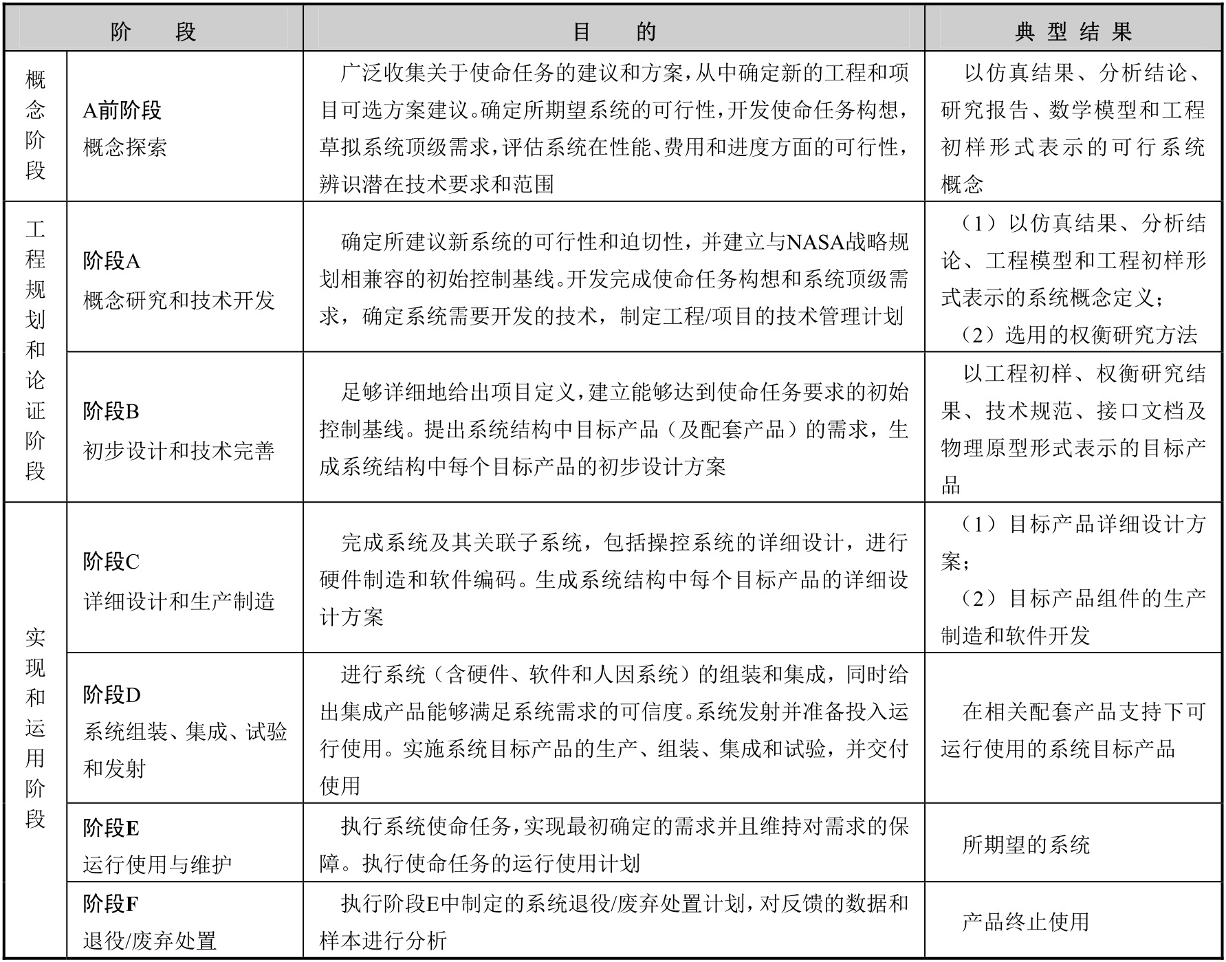 为了帮助了解系统工程引擎是如何应用的,本节给出一个示例。相关讨论围绕工程和项目寿命周期的各阶段展开,关于寿命周期的内容将在第3章中进行更深入的讨论。在第3章中将描述NPR 7120.5所定义的用于NASA空间飞行工程和项目的寿命周期的概念。项目寿命周期的阶段划分见表2.3-1。