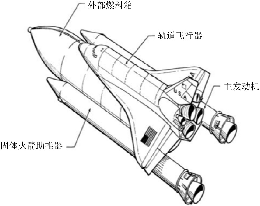接下来,使用前期开发的系统需求和运行使用构想,建立逻辑分解模型/框图(对应系统工程引擎的第3个流程),将需求转变为可视的形式,同时显示它们的关系。最终,这些框图、需求和运行使用构想文档被用来开发一个或多个可行的设计解决方案(对应系统工程引擎的第4个流程)。注意在当前时刻,显然这只是系统工程引擎的第一次运用,所开发的设计解决方案并未详细到足以实际建立任何系统。因此,设计方案可归纳为如下描述:“为实现这个空间运输系统,经过权衡研究,最佳选择是建造一个由三个部分组成的系统:(1)运载航天员和货物的可重用轨道器;(2)大型外部燃料箱;(3)能够为发射提供额外动力的可翻新重用的两个返回式固体火箭助推器。”当然,实际设计方案应该会有更为详细、明确的描述。图2.3-3对此进行了描绘。