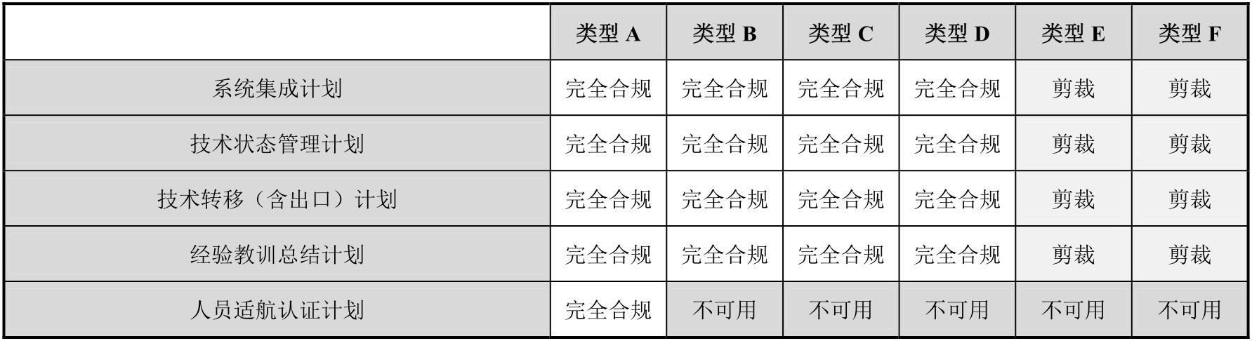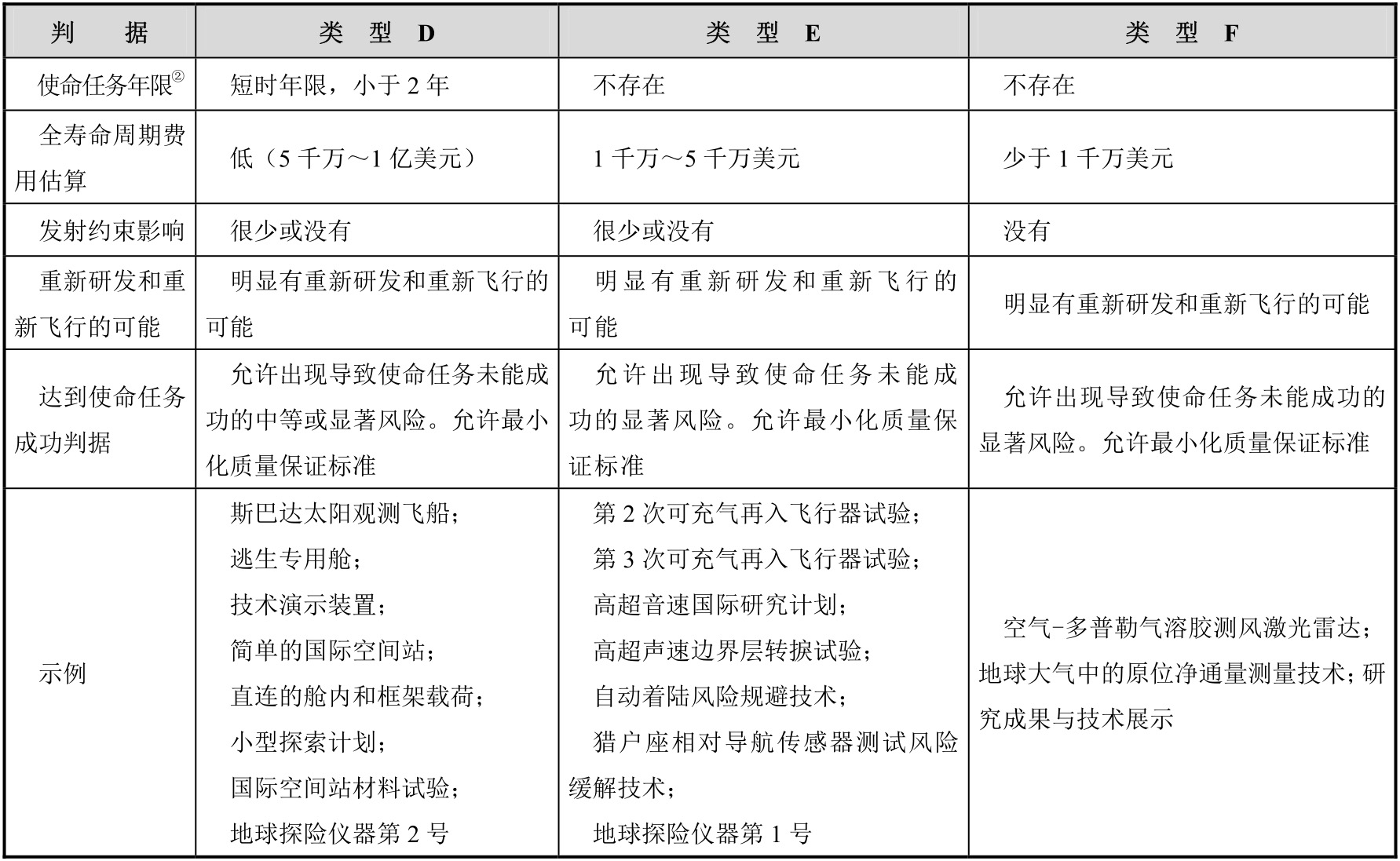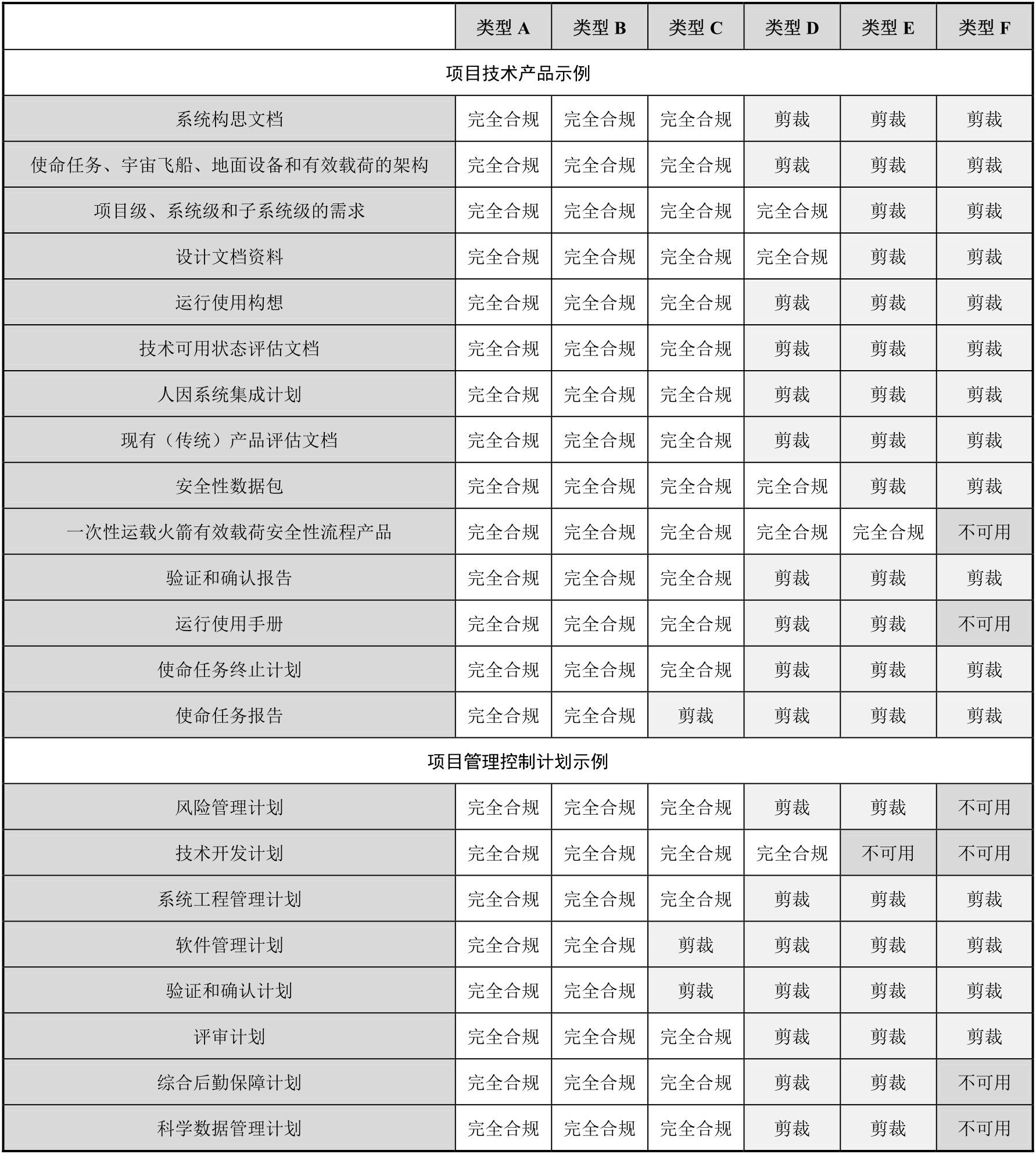表3.11-1给出了基于相关系统相应各类使命任务的示例,使命任务可分解为若干类型各不相同的项目,从非常复杂的类型A到极其简单的类型F。示例中在进行项目剪裁时,将特定项目安排在某个特殊类型中应被视为某种指导意见,而不是固定不变的特征化。许多项目符合多个类型的特征,因此在剪裁过程中,允许对那些更简单且对风险更开放的项目做较多的剪裁,而对那些复杂性和缓解风险起主导作用的项目做较少的剪裁。各个项目类型的剪裁准则和定义可能随使命任务所在的NASA中心及主管部门的不同而发生变化,这取决于哪种类型更适合他们对使命任务的认识。表3.11-2给出另一个示例,说明工程/项目所要求的文档资料应如何实现剪裁和客户定制。一般规律是越简单的项目,需要的文档资料越少,实施越少的正式评审。项目的产品数量也应当作为考虑因素。
