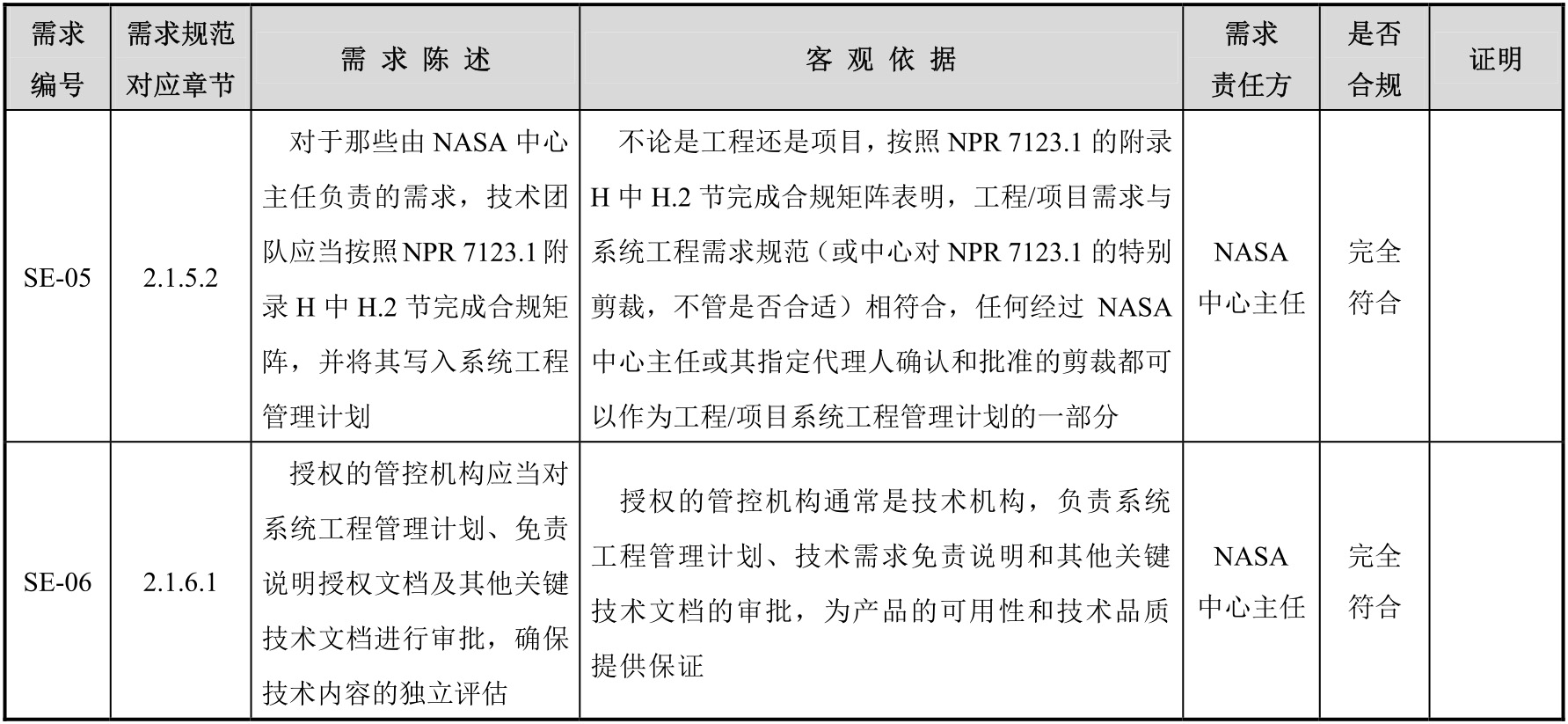 不论是NASA中心的要求还是工程/项目的要求,剪裁的结果及其客观依据应当反映在系统工程管理计划的最新版本中,并且应得到需求负责单位的正式批准。经过批准的免责说明/允偏说明可以在整个项目团队内部和各层级管理人员之间交流。如果需要在工程/项目内部进行独立评审,则可以对期望和评估准则进行适当修改。表3.11-3给出了依据NRP7123.1的附录H中H.2节合规矩阵进行剪裁的示例。